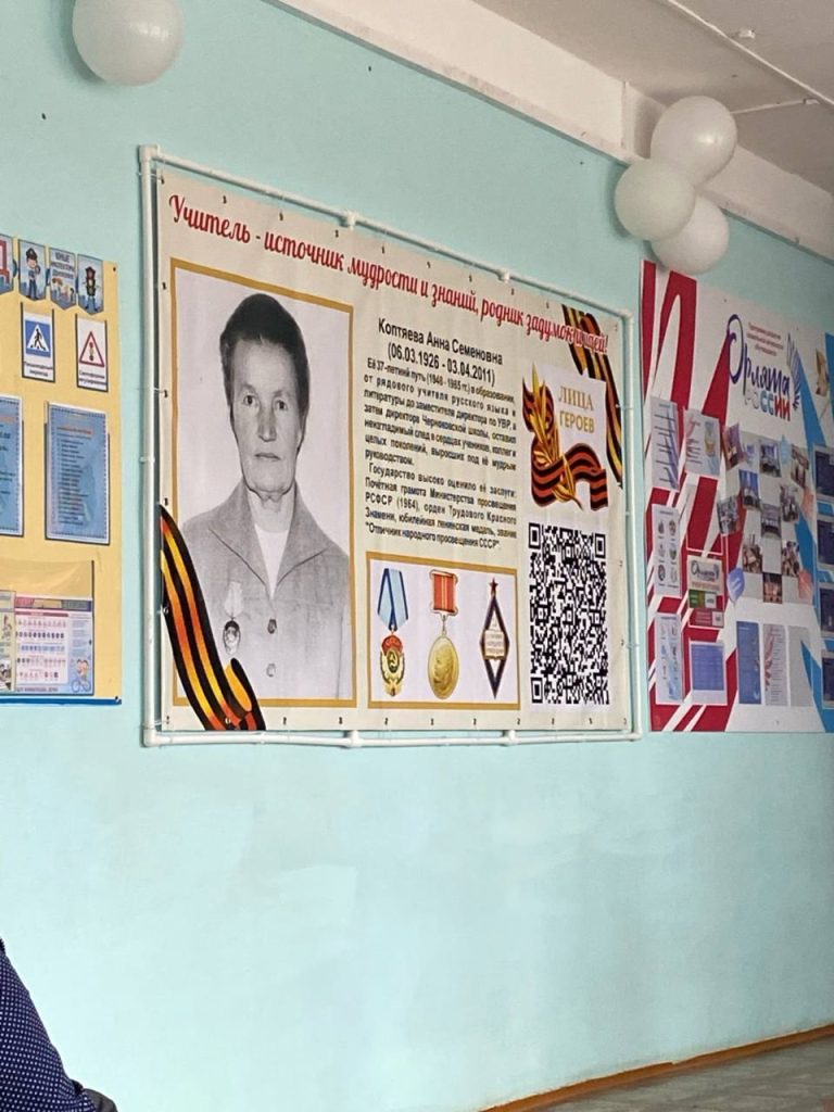 А также в рамках акции «Лица героев» был открыт баннер, посвященный педагогу Анне Семеновне Коптяевой, которая руководила школой в 70-е годы и стала душой коллектива, наставником молодым педагогам, примером порядочного, доброго и отзывчивого человека.